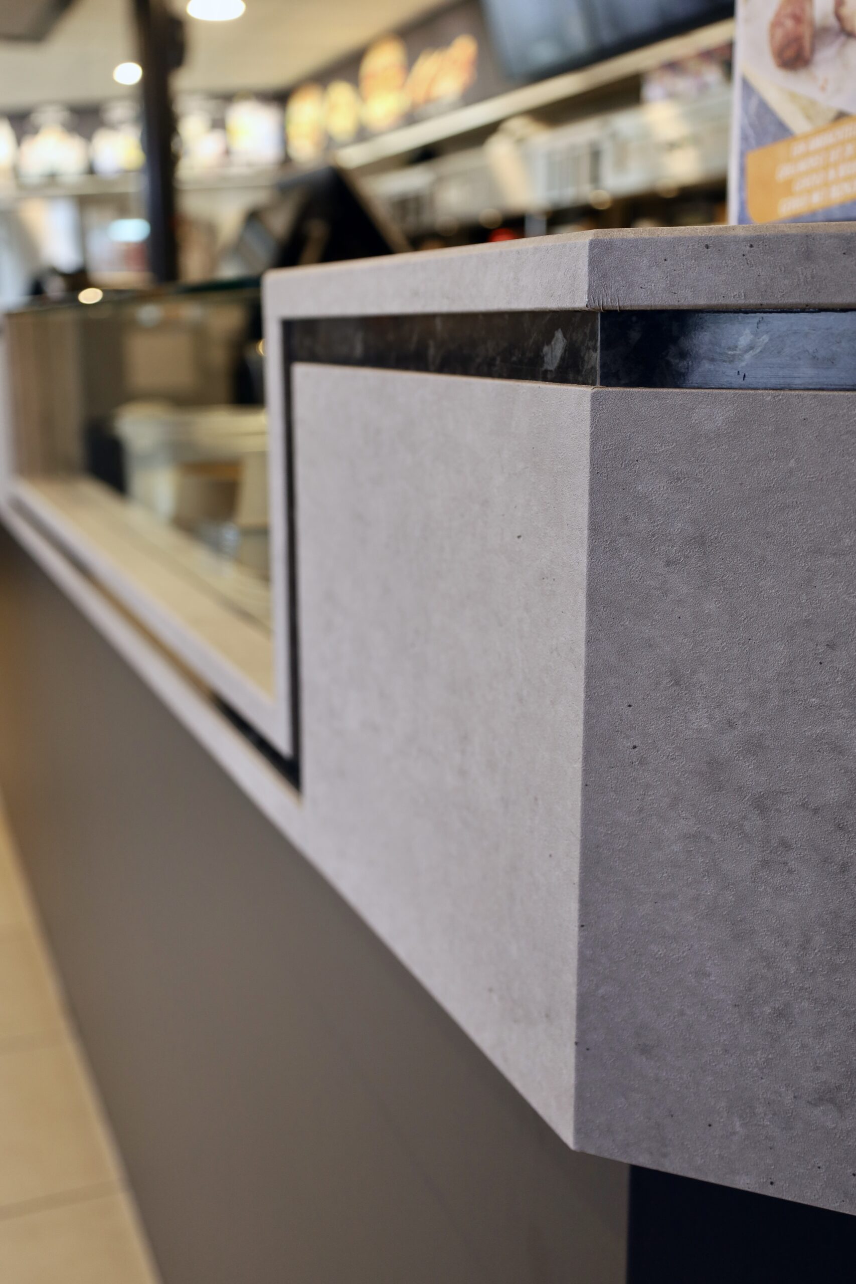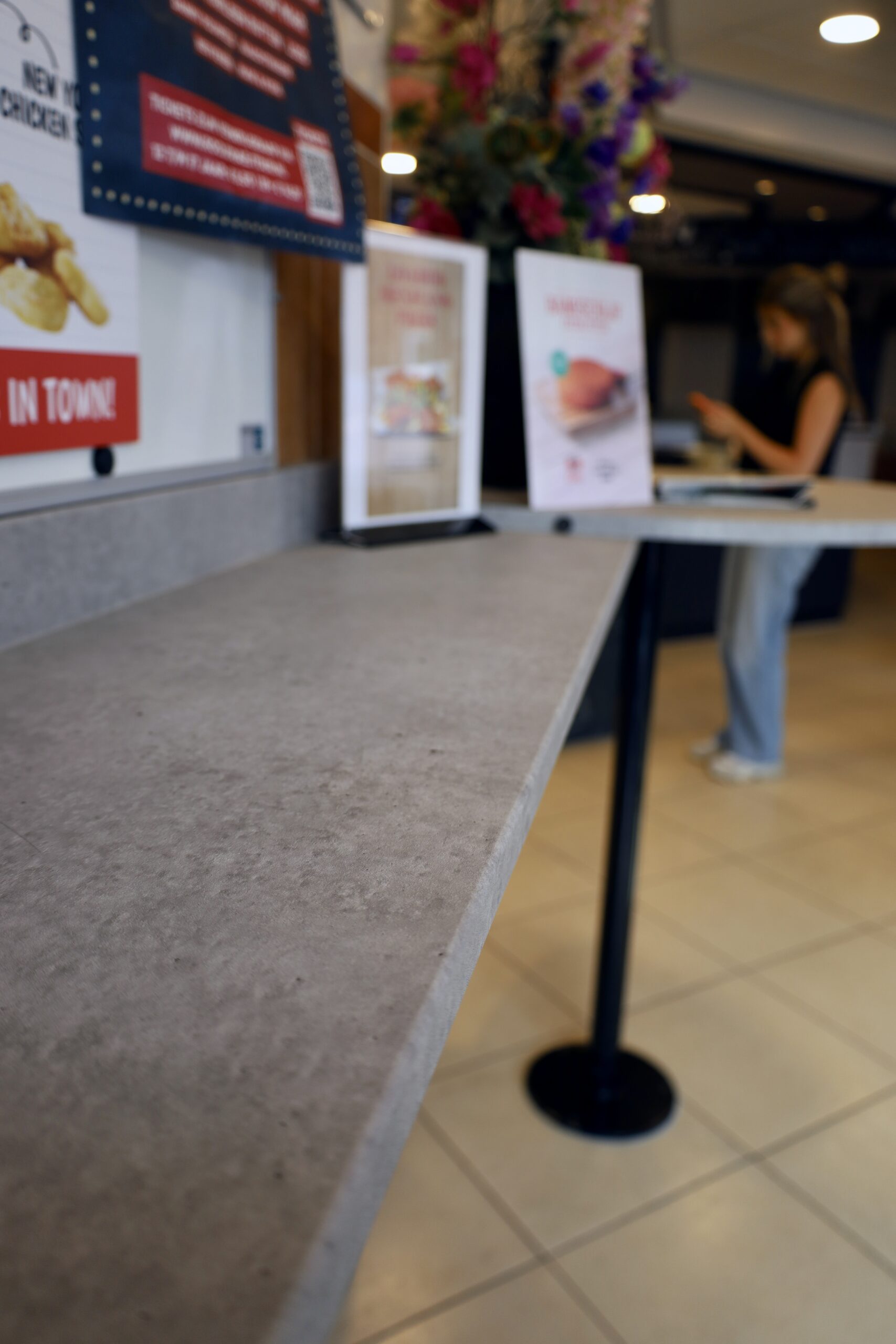We pakten het groots aan: de balie, kastjes en werkbladen achter de balie, de ronde tafel bij de ingang én een deel van het plafond kregen een nieuwe jas. Met een combinatie van een donkergrijze matte folie en een stoere betonlook (inclusief subtiele structuur) veranderde het interieur compleet.
